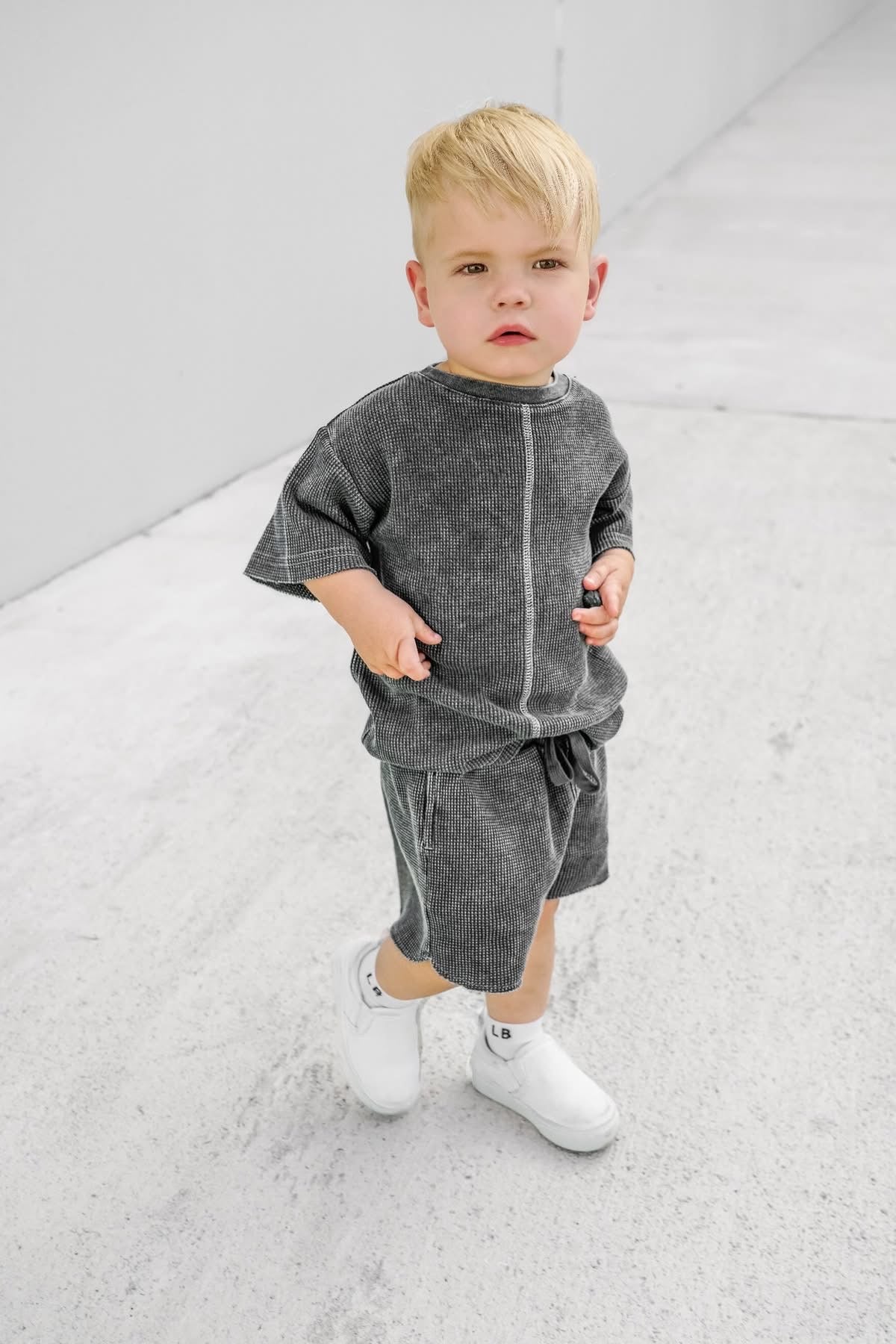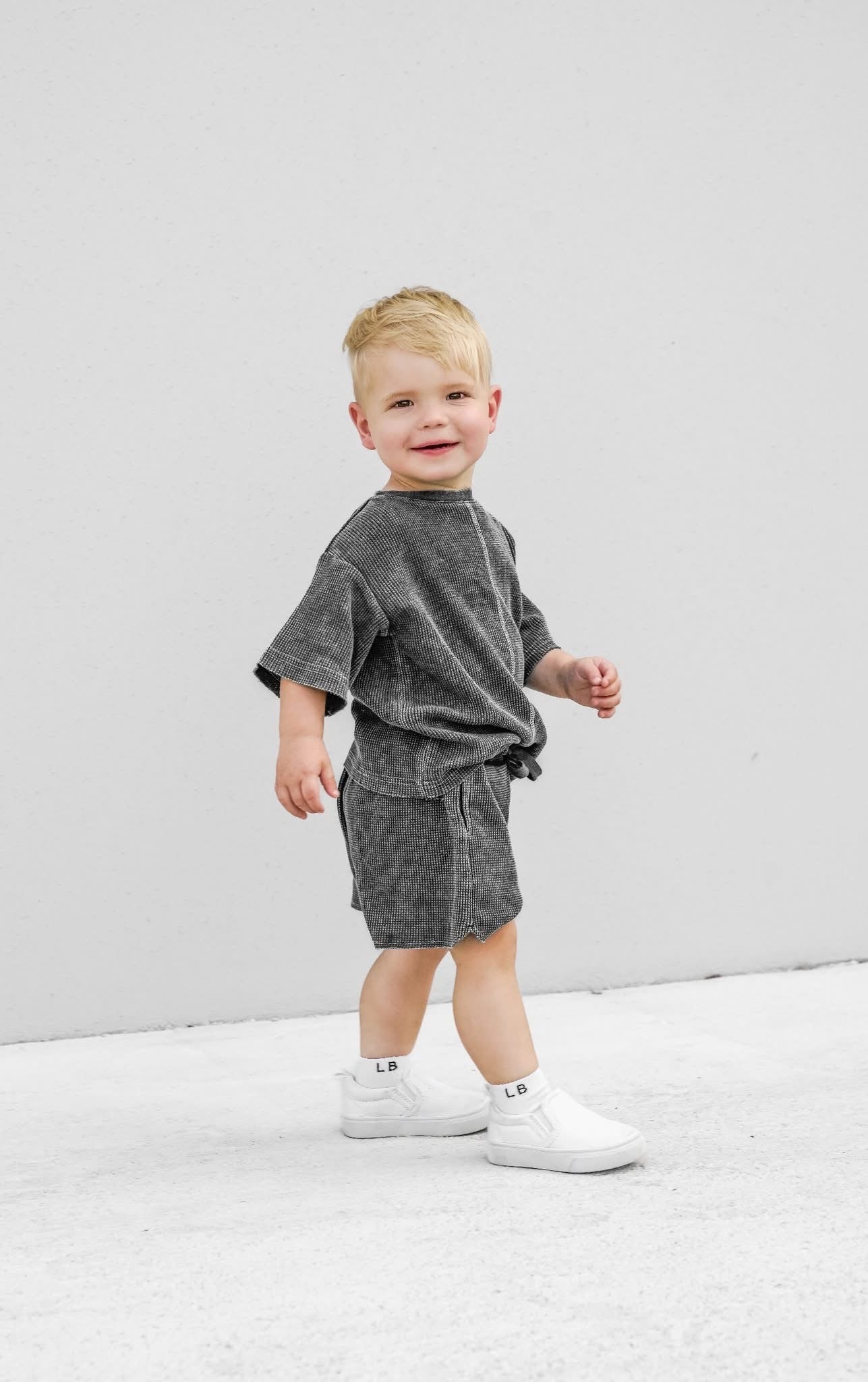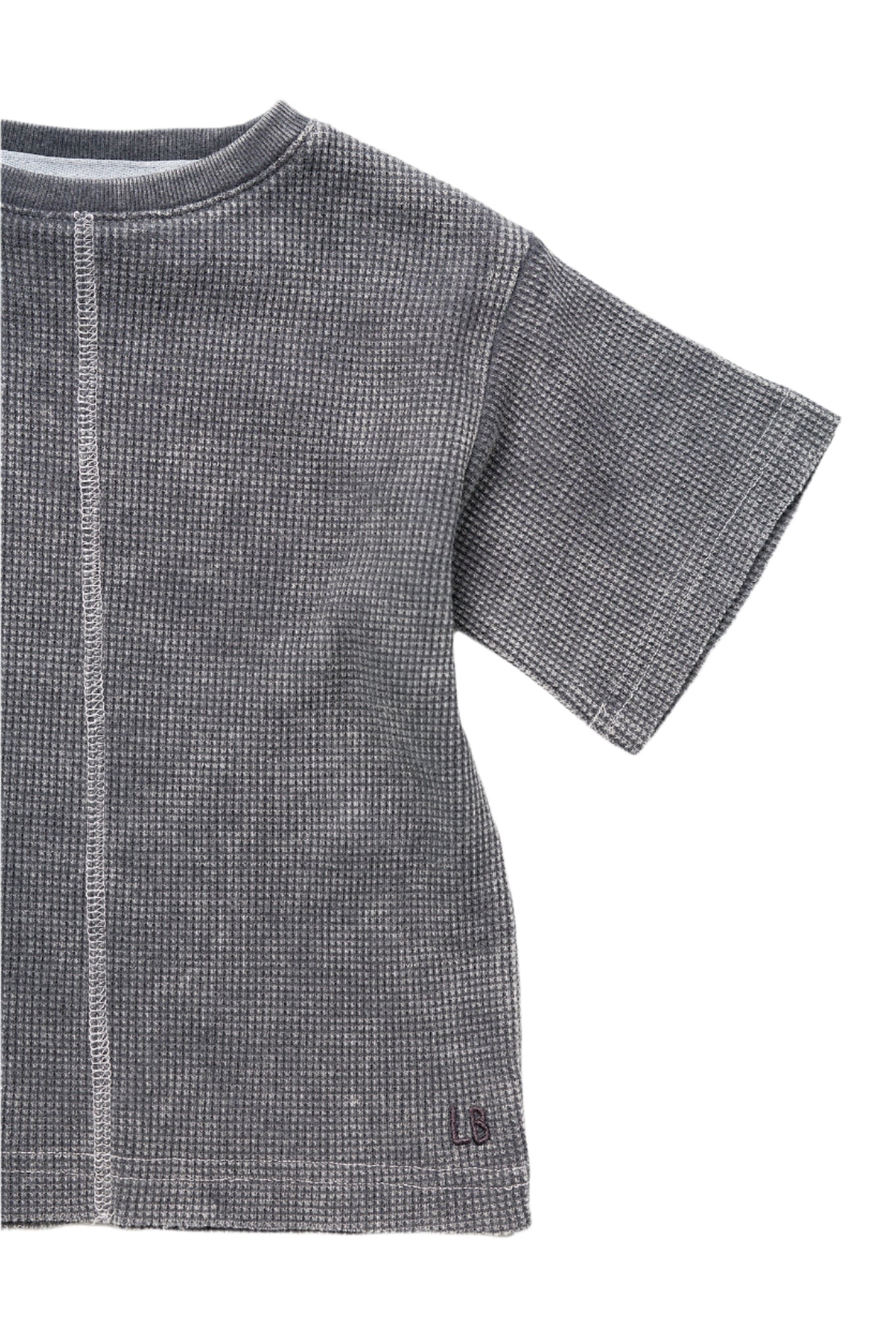 Simple, soft, and effortlessly cool. The Waffle Tee is a go-to staple for both you and your little one—perfect for easy days at home or out and about. Made from breathable waffle-knit fabric, it features a clean crewneck, center seam detail, and a relaxed fit for all-day comfort. Finished with our signature embroidered “LB” and a sewn-in care label for a tag-free feel. Wear it solo or pair it with the matching waffle shorts for a comfy, coordinated look.