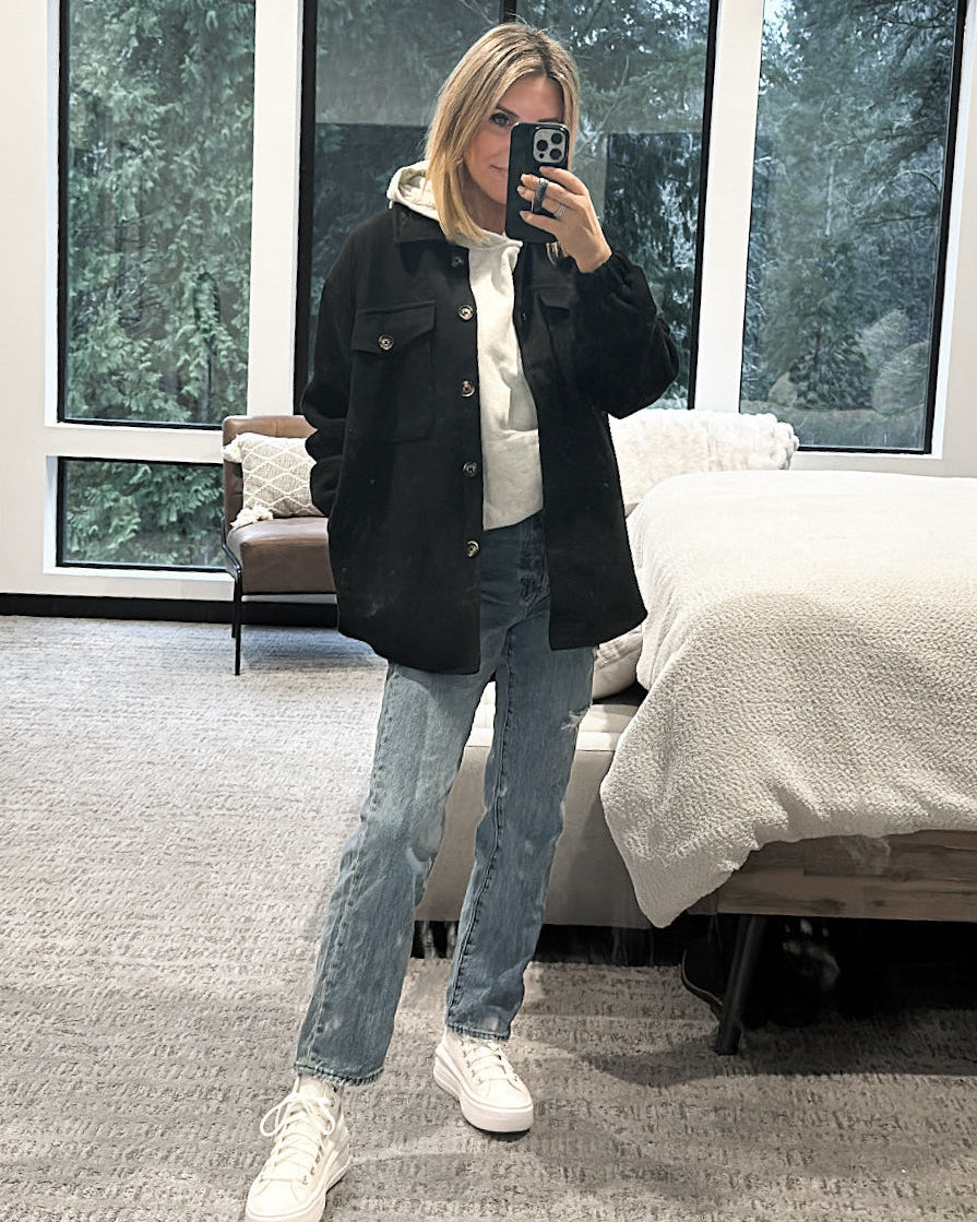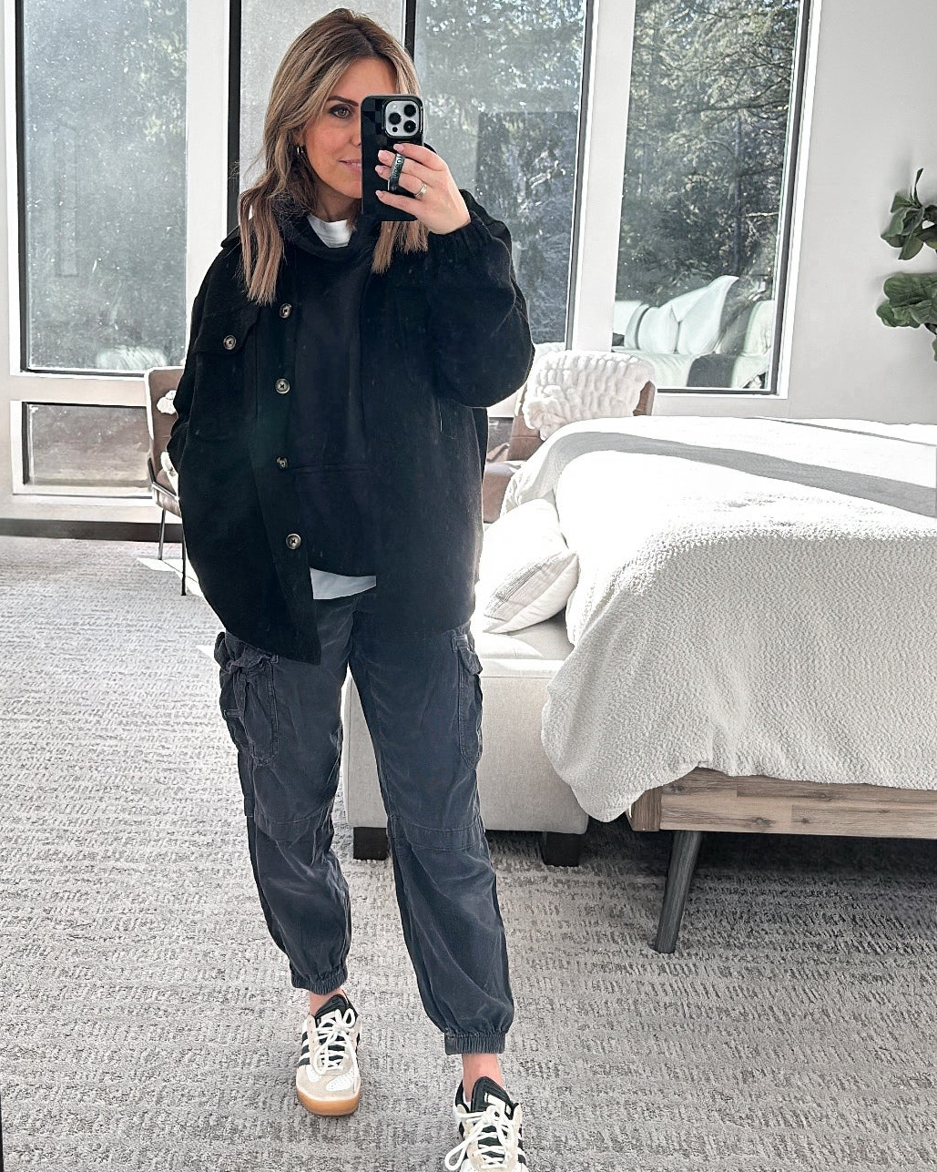 This versatile black shacket combines style and practicality for you and your little one. Made from durable yet soft fabric, it features front and hidden side pockets for convenience and a lightweight polyester lining for comfort. Perfect for layering on chilly days, it’s a timeless piece that adds effortless cool to any outfit.