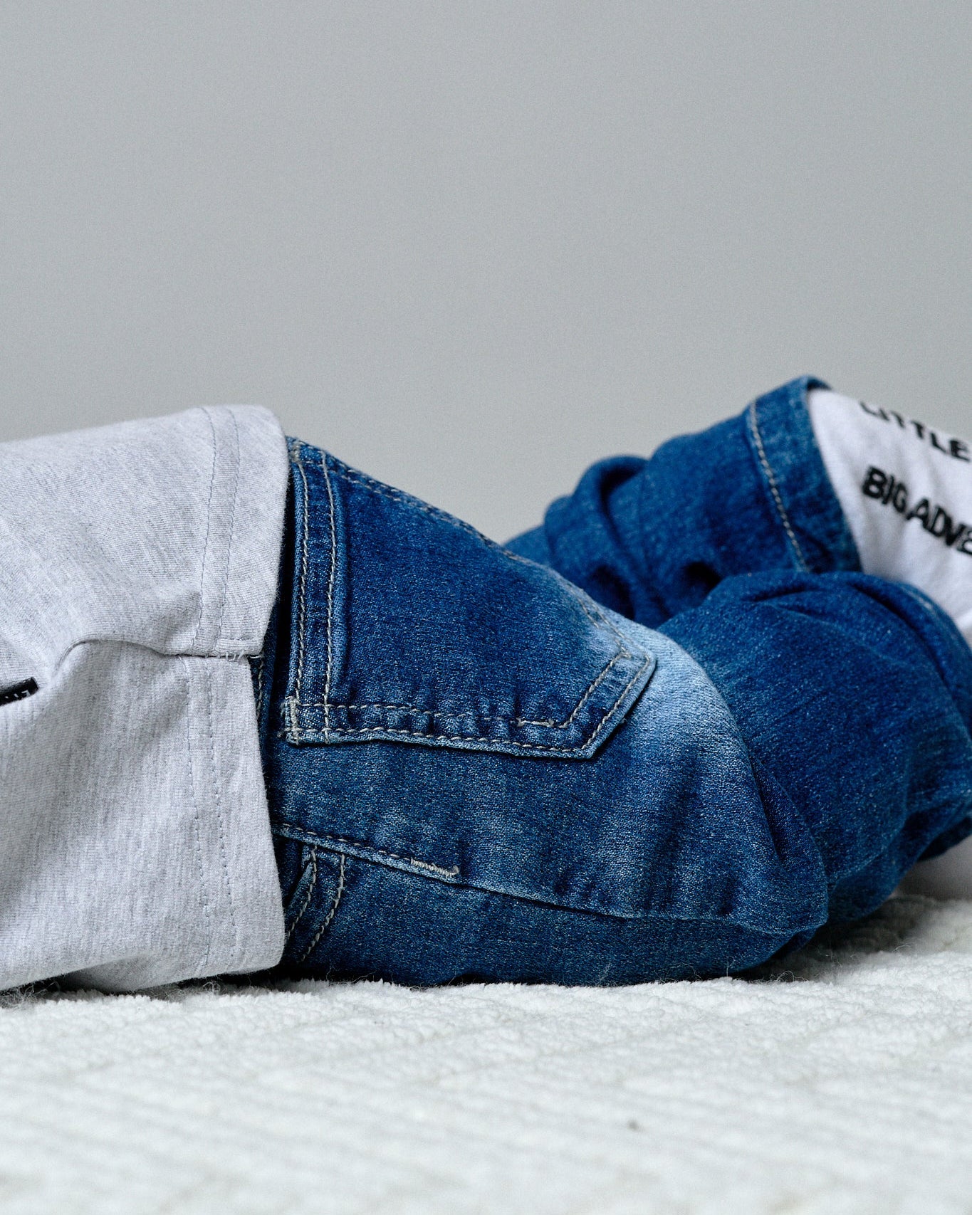 Meet your new favorite jeans. Our Distressed Denim makes any outfit look effortlessly cool. These jeans were designed with an elastic waistband + functioning drawstring for easy dressing, as well as a custom classic blue wash, stylish distressing, and a straight leg fit for all day comfort + non-restricting play.