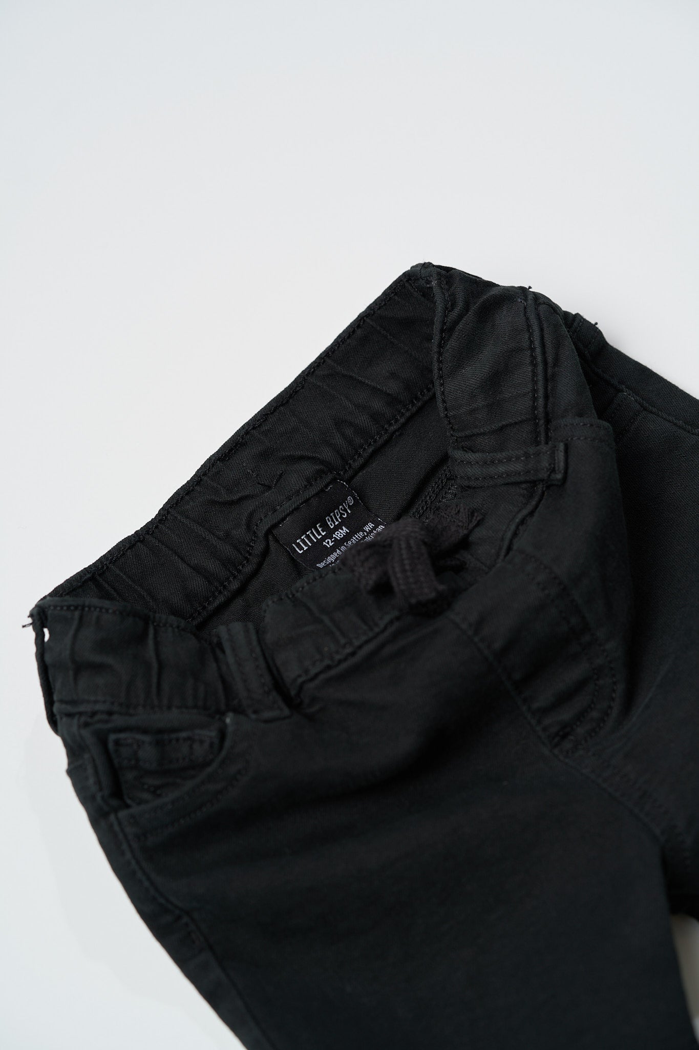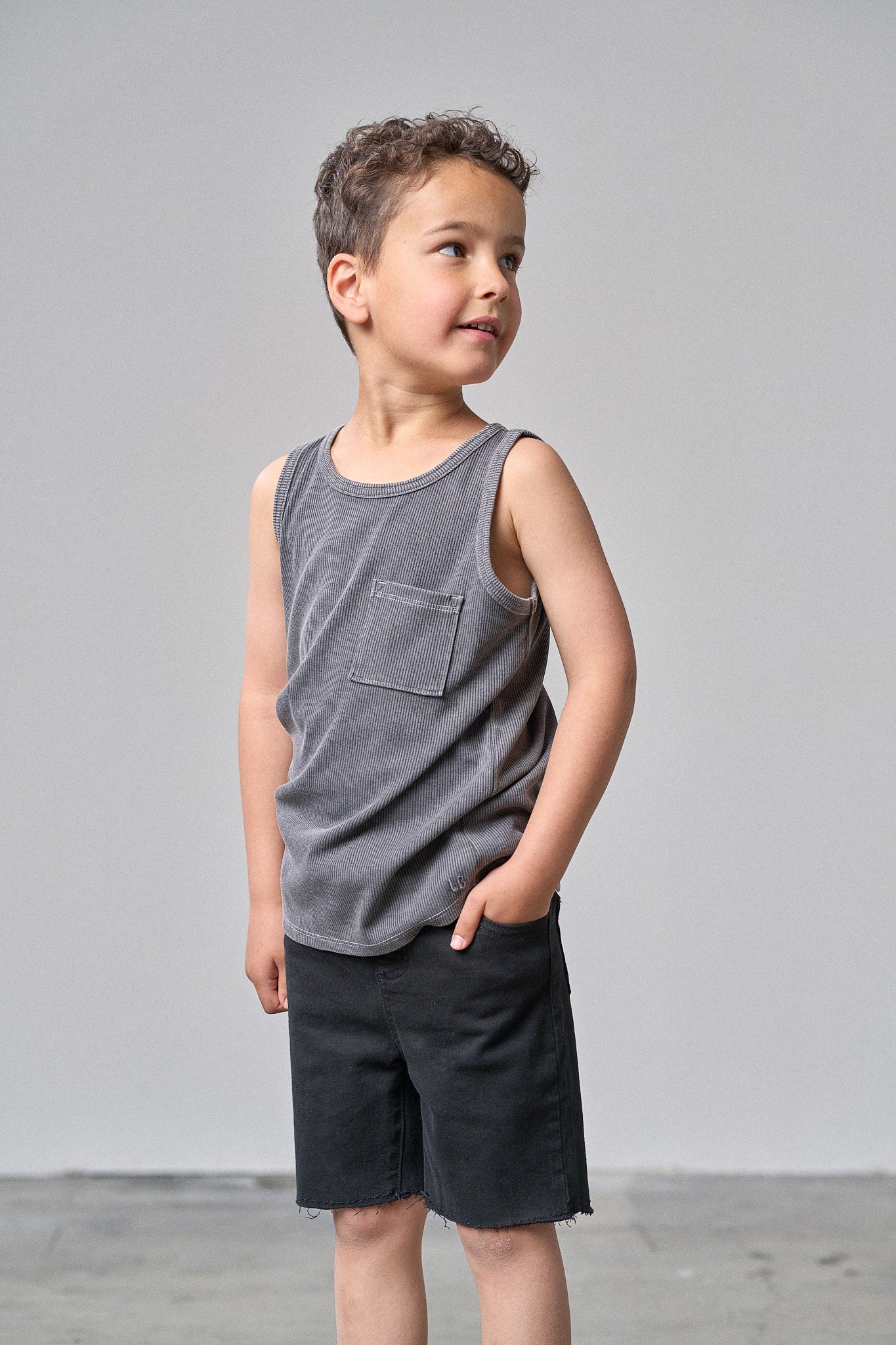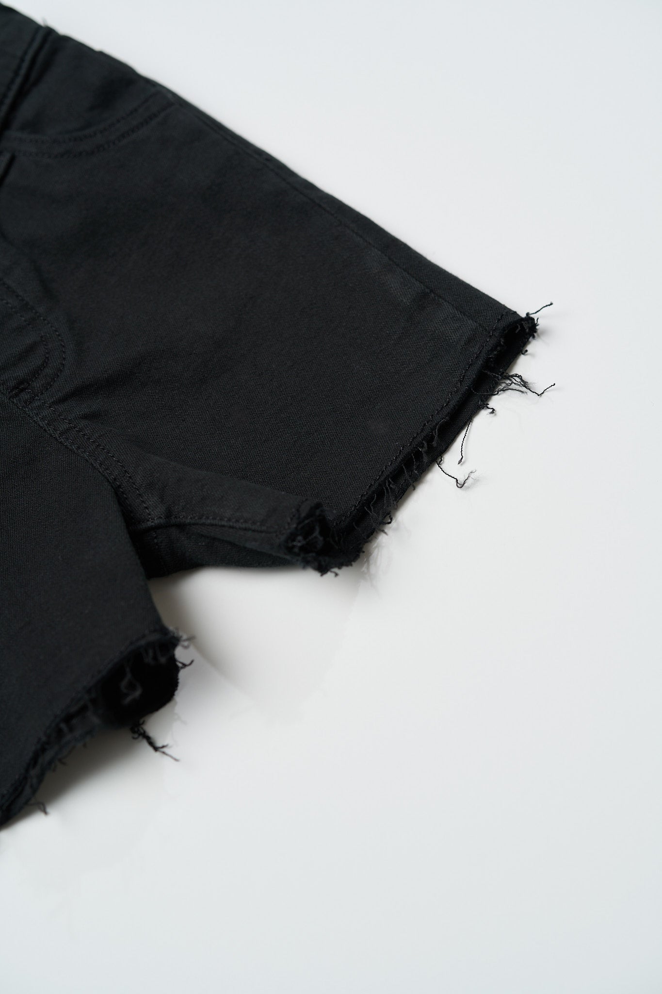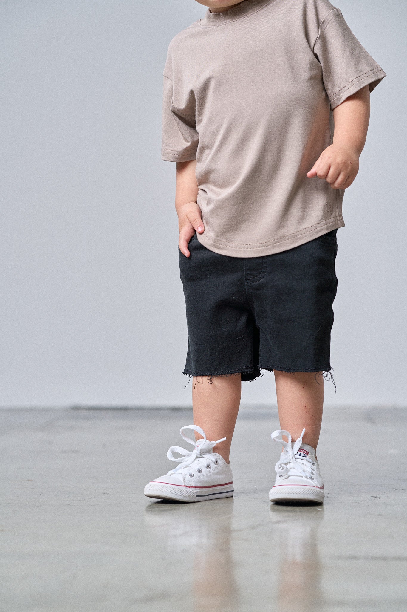 Built for board tricks, pavement adventures, and chill hangs. These black denim shorts bring serious skater energy with raw edge hems and a laid-back fit that moves like they do. The ribbed elastic waistband keeps things comfy whether they're grinding curbs or just cruising the sidewalk, and the sewn-in drawstring keeps it all secure—no slip-ups here. Front pockets are ready for snacks, skate wax, or whatever they're collecting these days. Finished with our signature “LB” stitch—because every skater’s got to rep their crew.