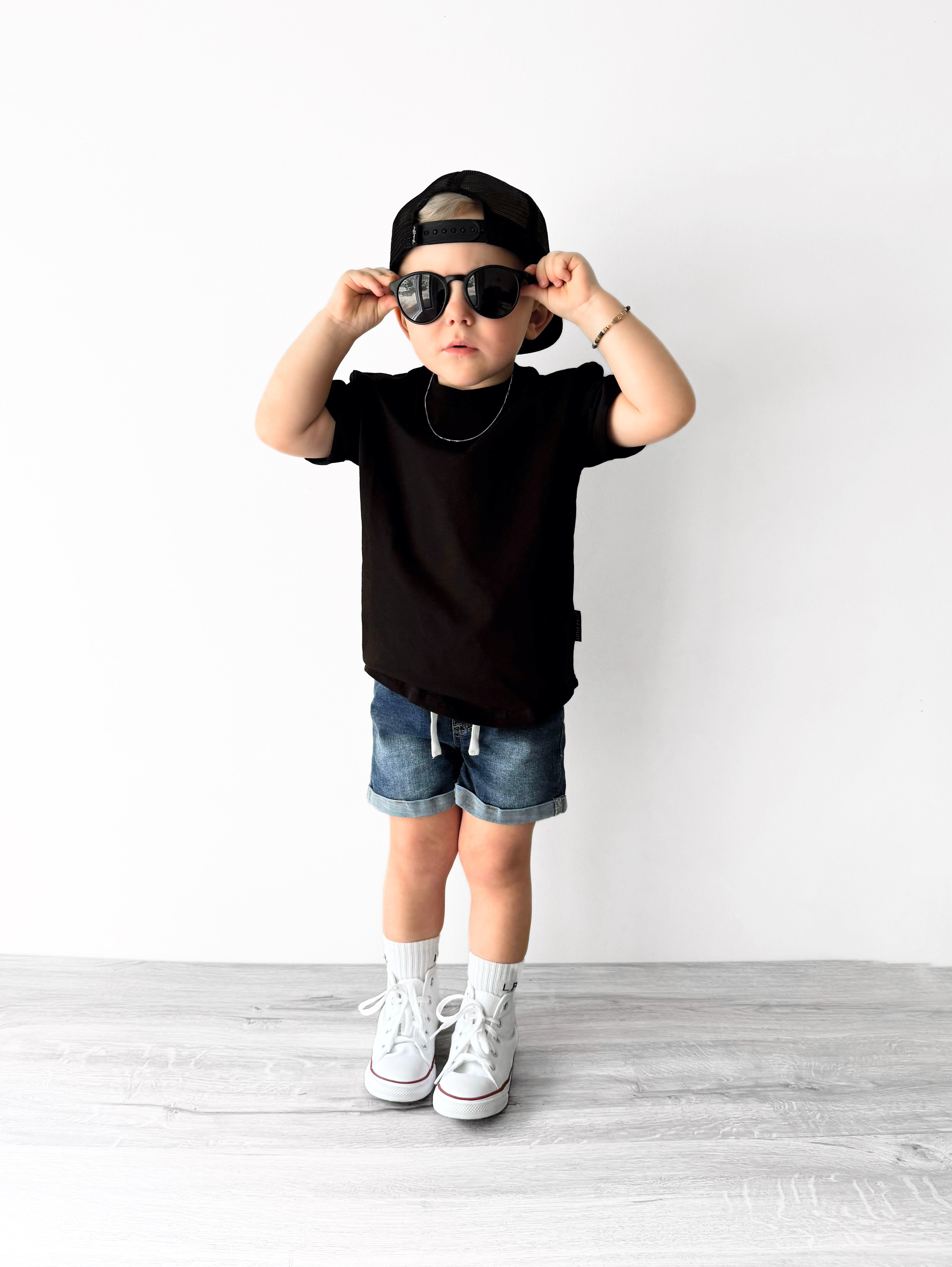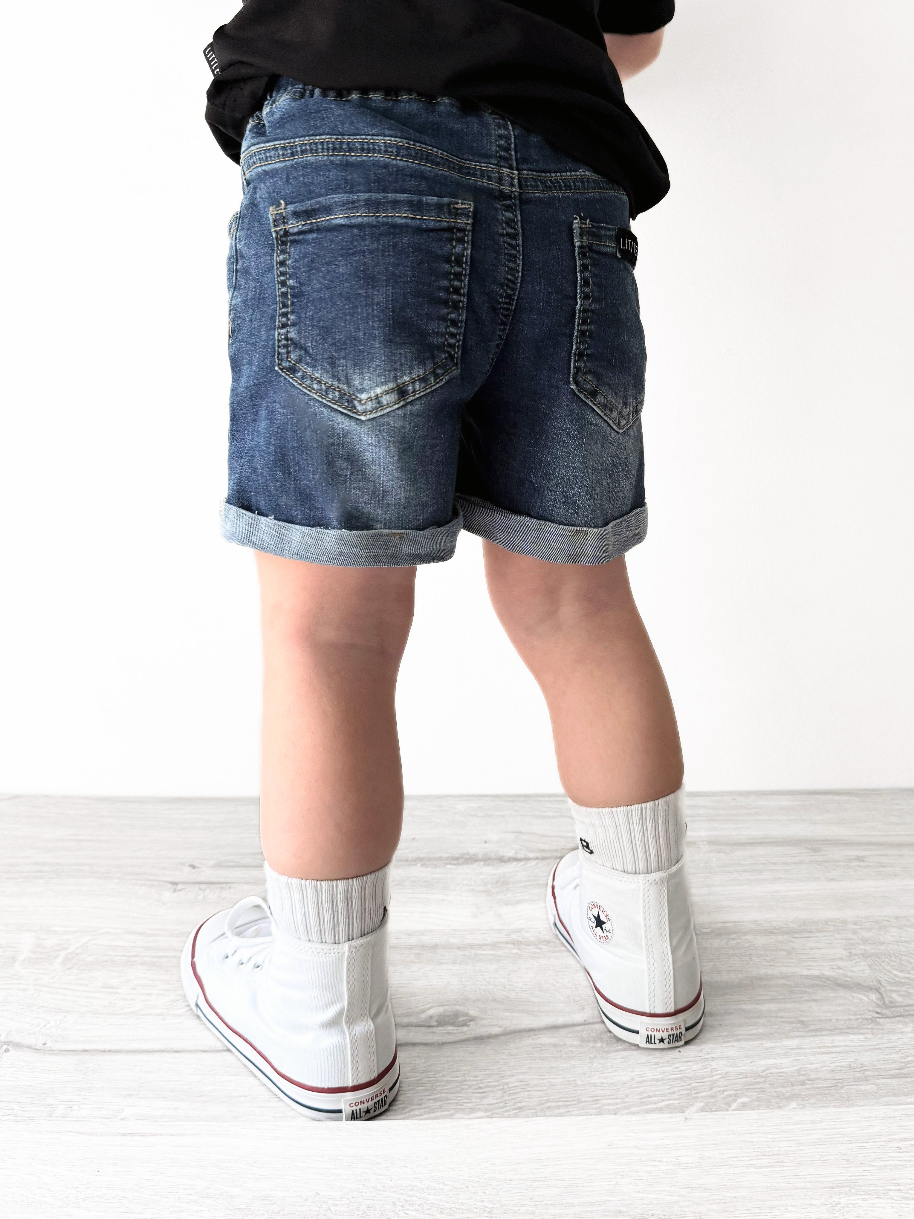 Meet your new favorite denim shorts. Our Classic Denim Shorts make any outfit look effortlessly cool. These shorts were designed with an elastic waistband + functioning drawstring for easy dressing, as well as a custom classic blue wash + rolled leg cuffs for chill warm-weather style.