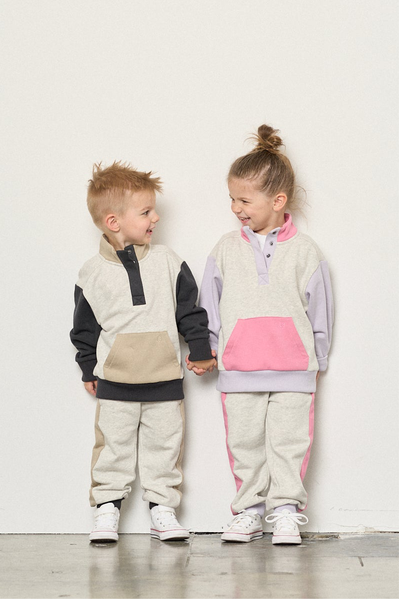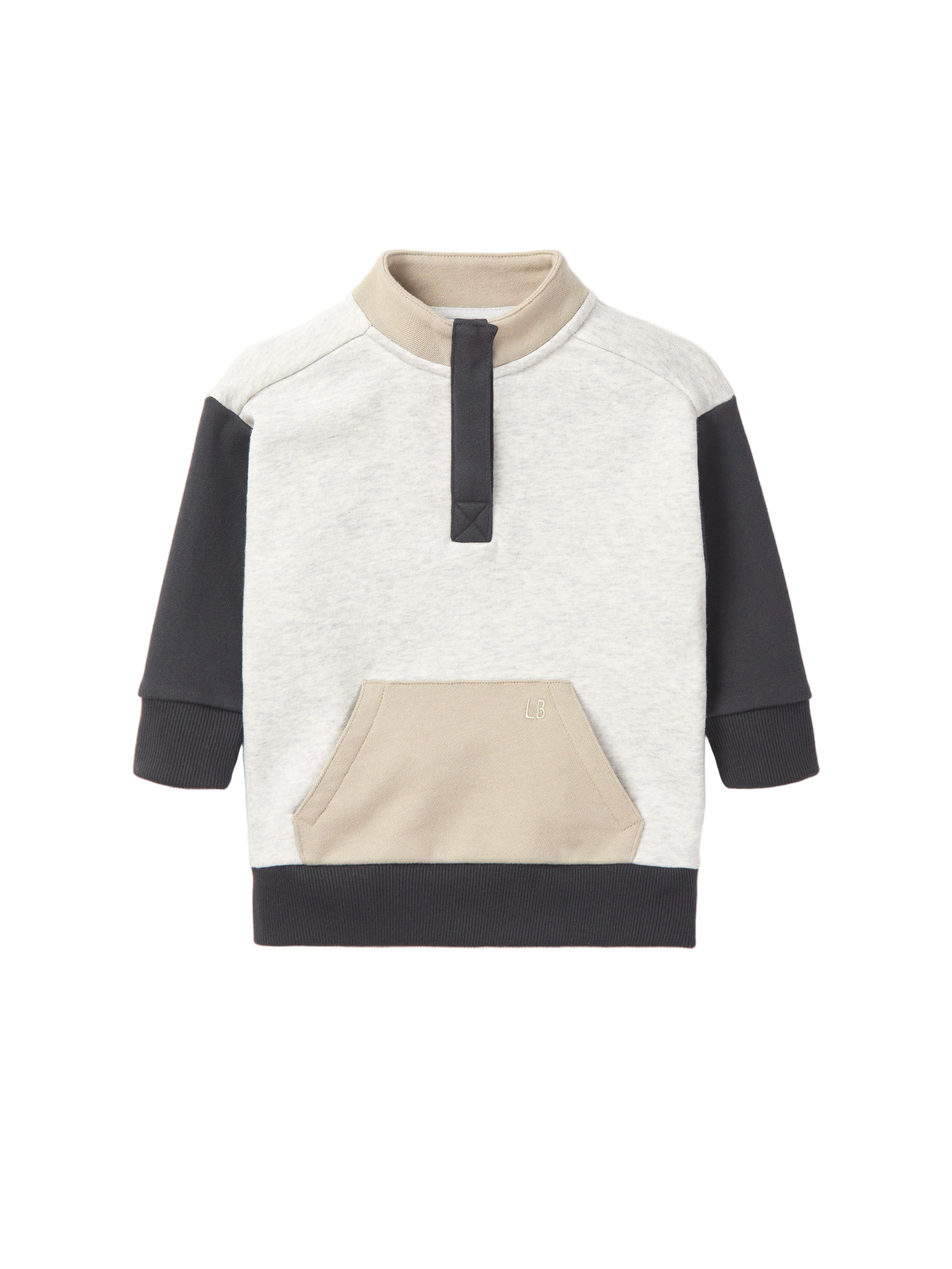 Everyday essential, upgraded. With a sporty mockneck collar and hidden snaps for quick + easy changes, this pullover is built for comfort and ease. Ribbed neckline, cuffs, and hem keep the fit snug, while rollable cinched cuffs make it easy to wear their way. The stone grey colorblock brings a timeless, laid-back vibe that goes with anything.
