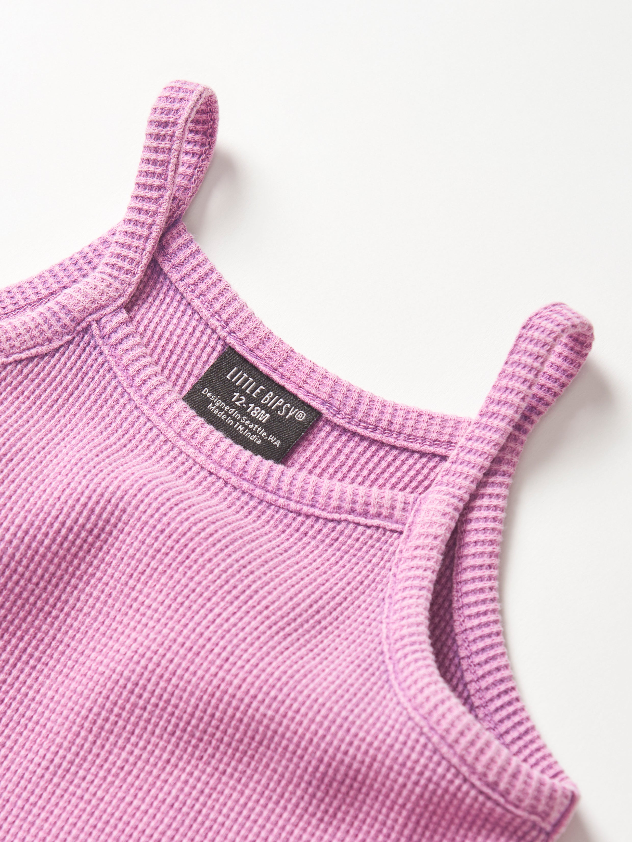 Sweet, simple, and perfect for sunny days. The Girls Waffle Tank in soft purple features spaghetti straps, a slight high-low hem, and side slits for easy layering and extra wiggle room.