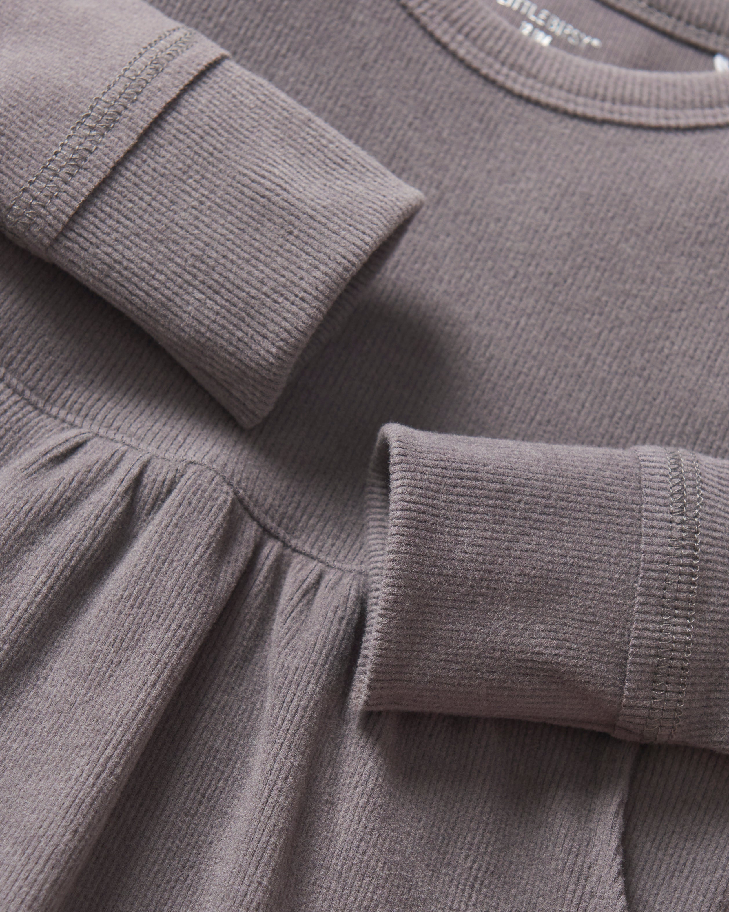 Soft, simple, and made for movement. The brushed ribbed fabric and ribbed trim details give this dress a cozy, elevated feel. Finished with functional front pockets and a modern graphite tone for effortless everyday style.