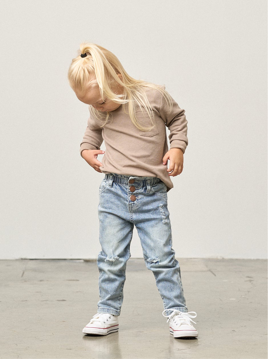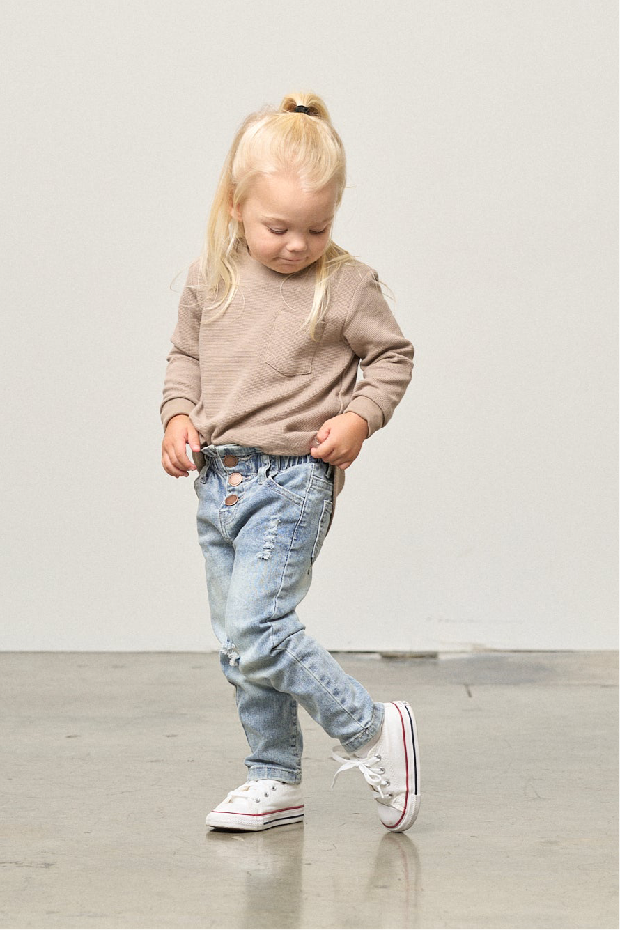 Our ever so loved Paperbag Denim is back. Made with a cinched, stretchy waistband for all-day comfort and a relaxed fit that’s easy to move in, these jeans are perfect for play or everyday wear. The light distressing adds a playful touch, while the front and back pockets and our three signature brass buttons keep them both cute and practical.