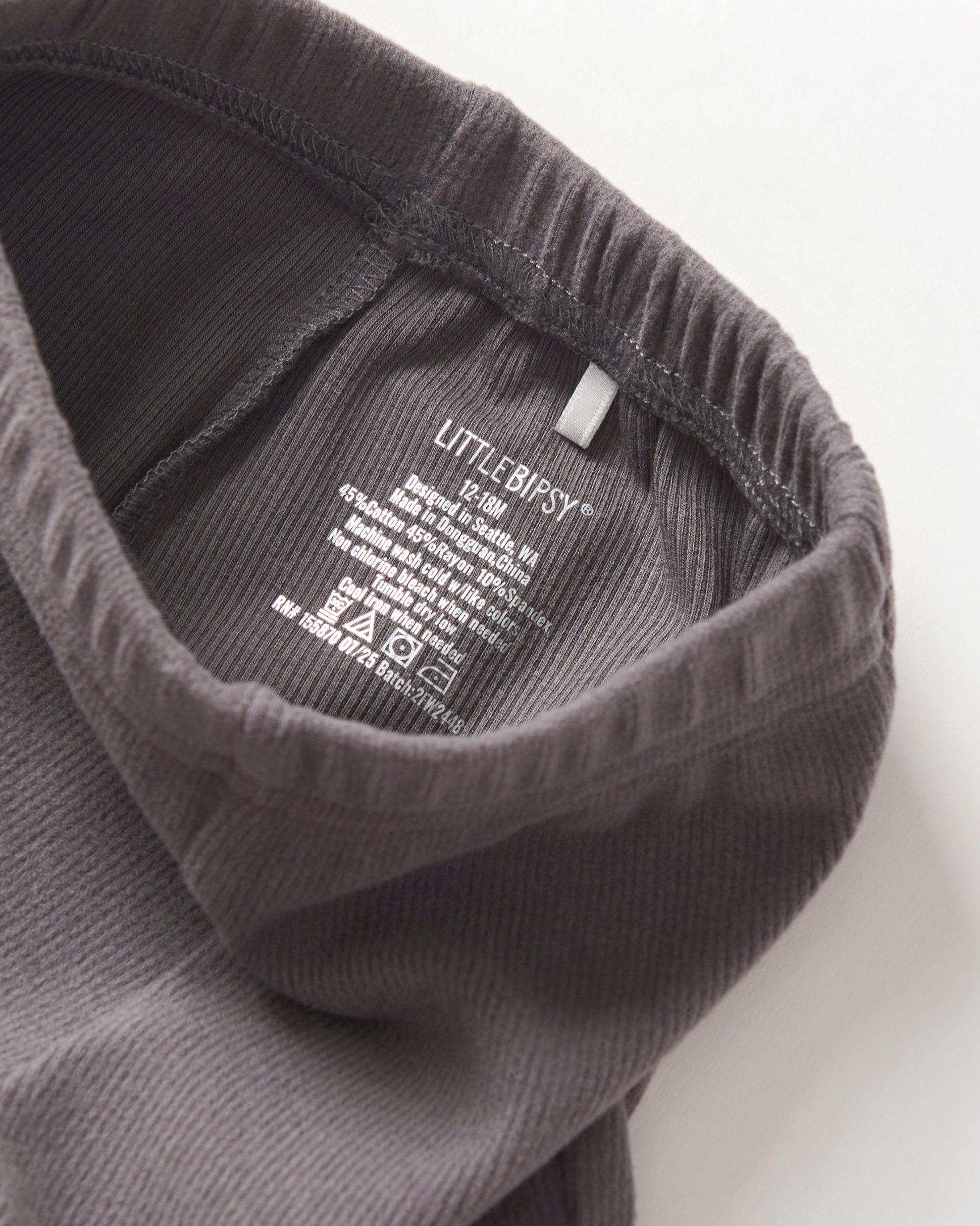A modern staple made for comfort and style. Crafted from our soft brushed ribbed fabric in a cool Graphite hue, these flare pants move with your little one all day long. The ribbed elastic waistband keeps the fit easy and snug, while the scalloped flare hem adds just the right touch of detail. Effortless, comfy, and made to pair with anything.