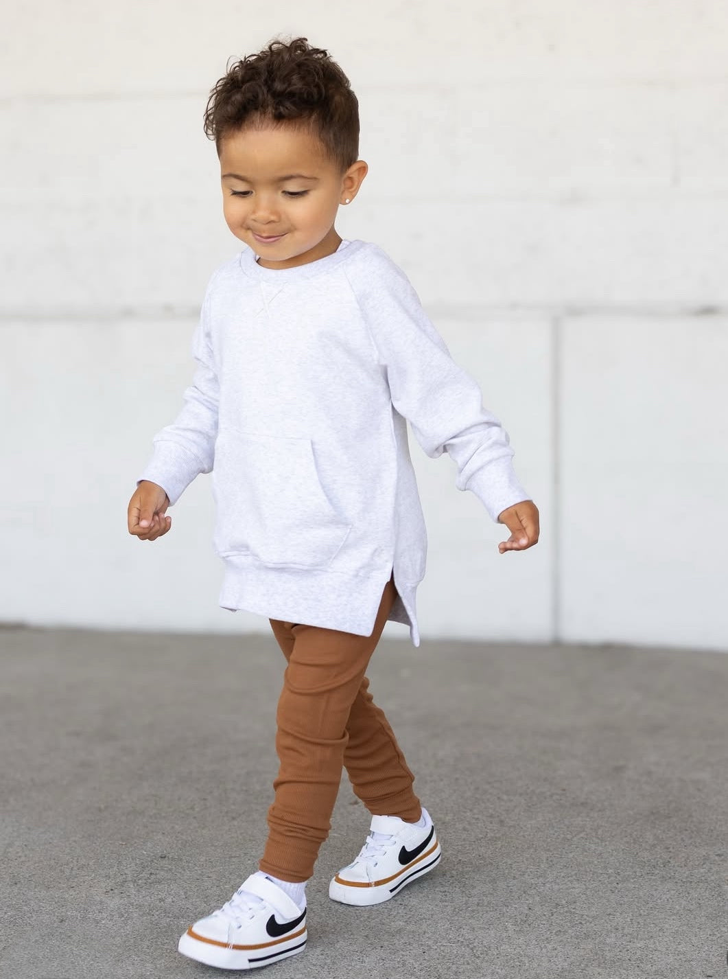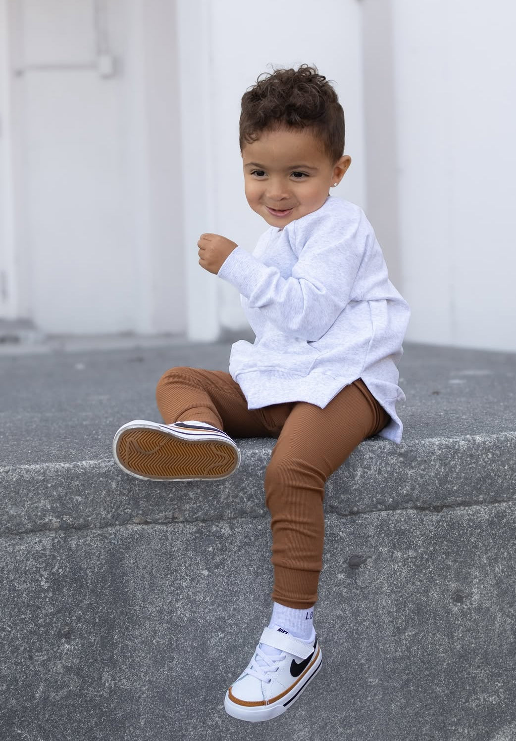 Our cozy Ribbed Leggings are a must-have staple for your little one's wardrobe. In a warm Chestnut hue, these high-waisted, ultra-soft leggings are fitted, stretchy, and perfect for all-day play. Designed with a comfy elastic waistband and rollable ankle cuffs, they pair perfectly with an Oversized Bamboo Tee or Pullover for an effortlessly cute and comfy look.