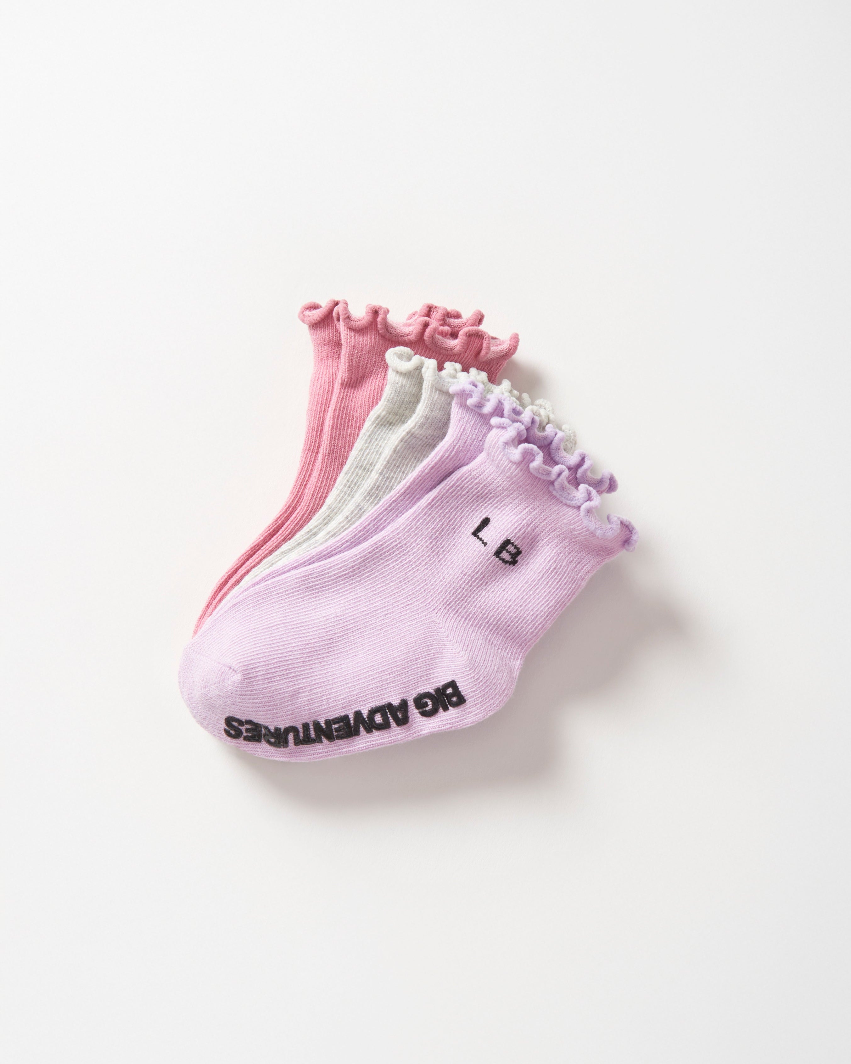 Everyday comfort with a soft, playful touch. This 3-pack includes Rose, Light Heather Grey, and Lilac—made from a stretchy, comfy blend for all-day wear. Designed with our “Little Steps, Big Adventures” grip bottom and finished with a ribbed ruffle detail and classic woven “LB” logo.