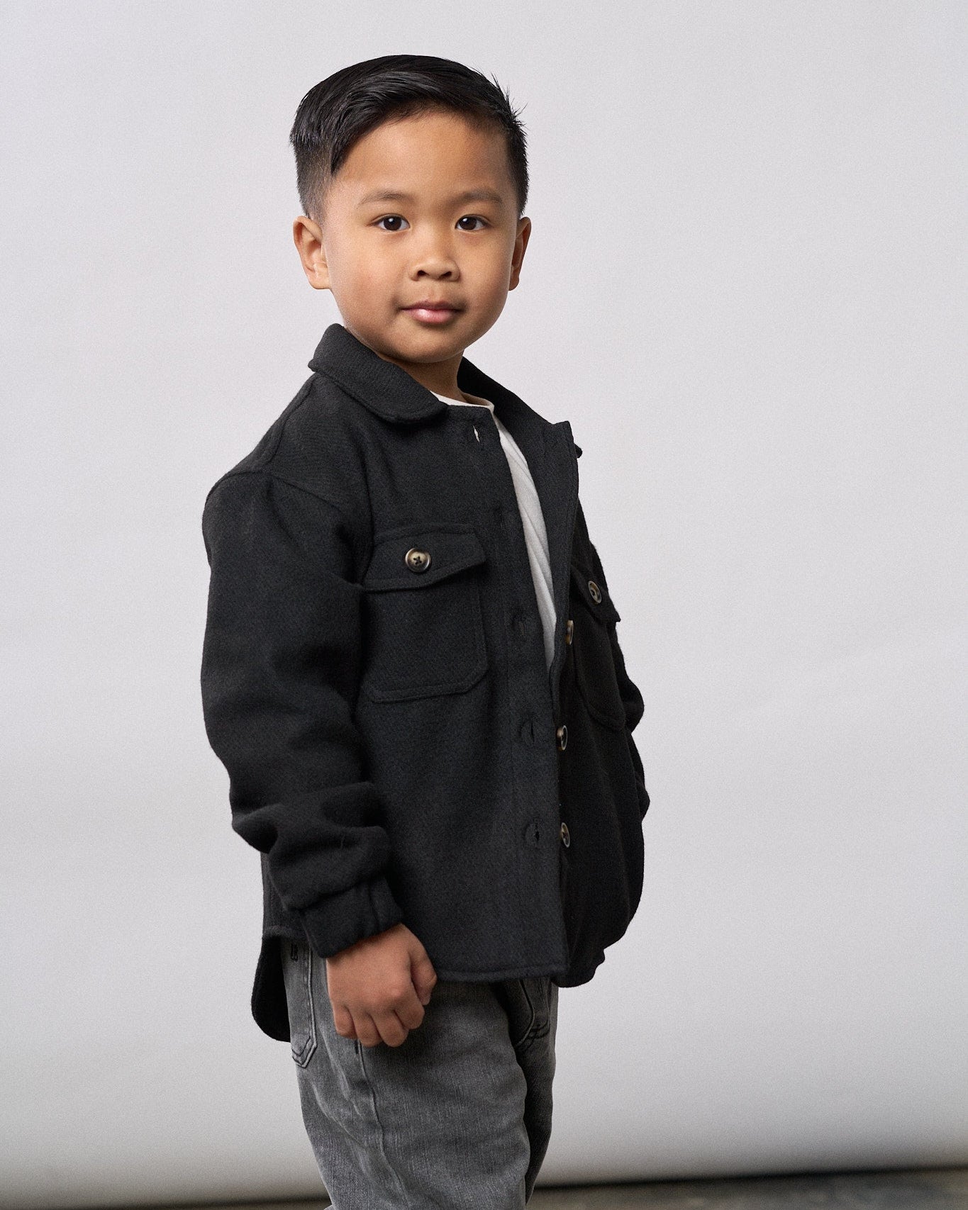 This versatile black shacket combines style and practicality for you and your little one. Made from durable yet soft fabric, it features front and hidden side pockets for convenience and a lightweight polyester lining for comfort. Perfect for layering on chilly days, it’s a timeless piece that adds effortless cool to any outfit.